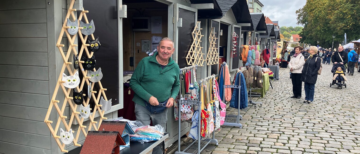 Frank Martin, Vorstandsmitglied des Vereins zur Förderung des Handwerks Thüringen e.V., präsentiert stolz handgefertigte Produkte von 'einzigartig-handgemacht' in einer der liebevoll gestalteten Hütten des Handwerkerdorfs auf dem Weimarer Zwiebelmarkt.