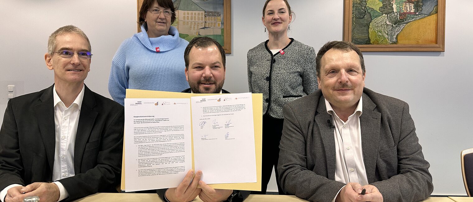 Von links: Harald Liese (stellvertretender Schulleiter des SBZ Gotha-West), Pia Sobanic (Geschäftsführerin der Kreis-handwerkerschaft Gotha), Landrat Onno Eckert, Judith Döring (Abteilungsleiterin Berufliche Bildung Handwerkskammer Erfurt) und Dr. Uwe Kirschberg (Schulleiter des BSZ "Hugo Mairich") haben den Kooperationsvertrag unterzeichnet.