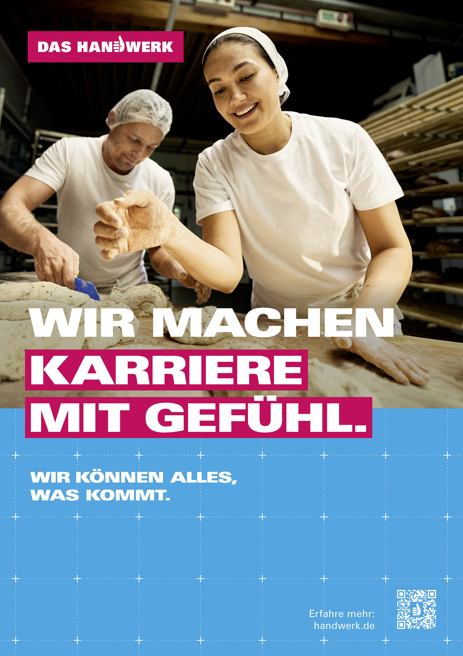 Muss Karriere immer Kälte, Hamsterrad und Ellenbogen bedeuten? Das Handwerk stellt diesem klassischen Bild einen eigenen Karrierebegriff entgegen und besetzt damit ein Thema, mit dem es bislang nicht unbedingt in Verbindung gebracht wird. Die Kampagne, die ab heute deutschlandweit zu sehen ist, steht unter dem Motto „Wir machen Karriere mit Gefühl.“ Sie wendet sich vor allem an die junge Generation, die eine herkömmliche Karriere „um jeden Preis“ zunehmend ablehnt.