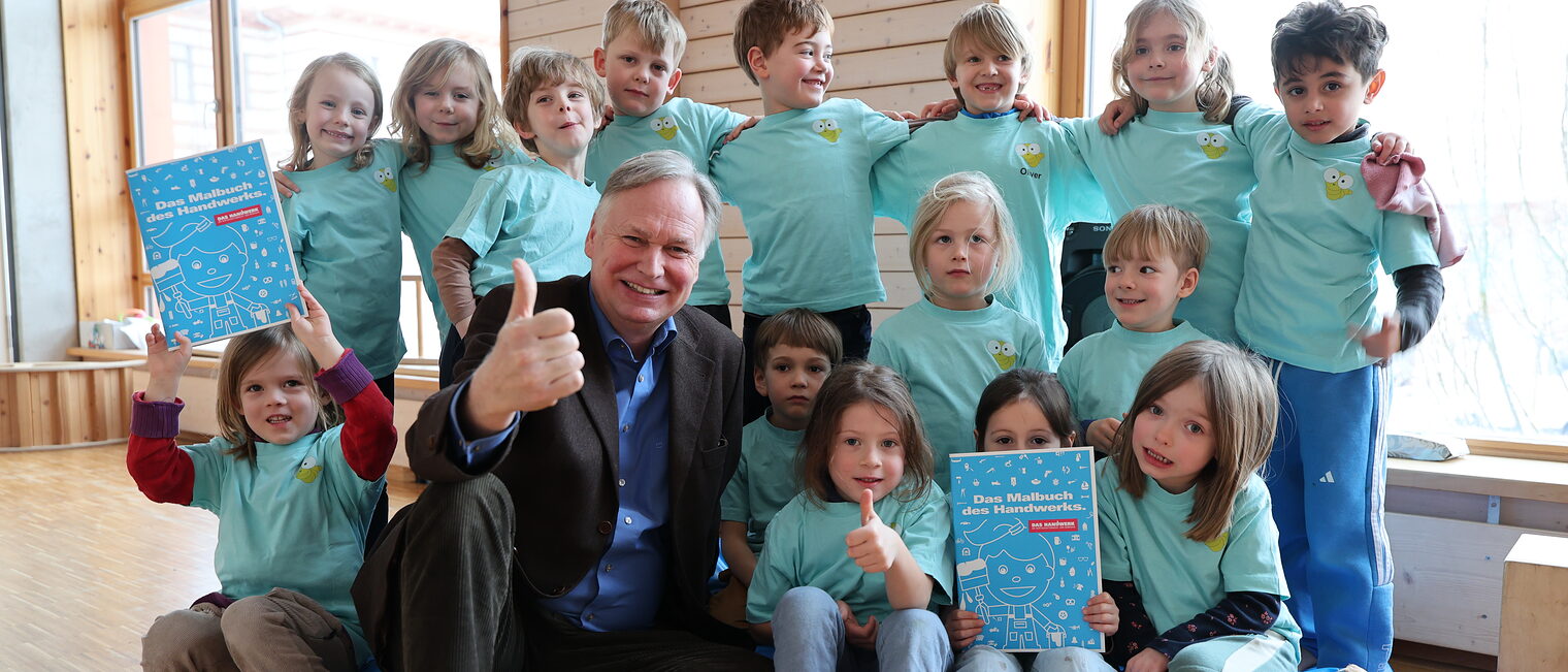 Einen ganz besonderen Auftakt erlebten die Kinder bei der persönlichen Übergabe der Wettbewerbsunterlagen durch Stefan Lobenstein, Präsident der Handwerkskammer Erfurt. Mit dem großen Handwerkerbuch und dem Malbuch im Gepäck nahm er sich Zeit für die Vorschüler, stellte ihnen verschiedene Handwerksberufe vor und bezog sie aktiv mit ein. Schnell wurde geraten, gelacht und gestaunt. „Ob für die Haare oder die Schuhe, ob für den knurrenden Magen oder das kaputte Auto, ob für Licht oder Möbel im Haus: Das Handwerk ist einfach überall. Und es braucht kluge, kreative Köpfe, die unsere Betriebe in Zukunft weiterführen“, machte Lobenstein den Kindern Mut.